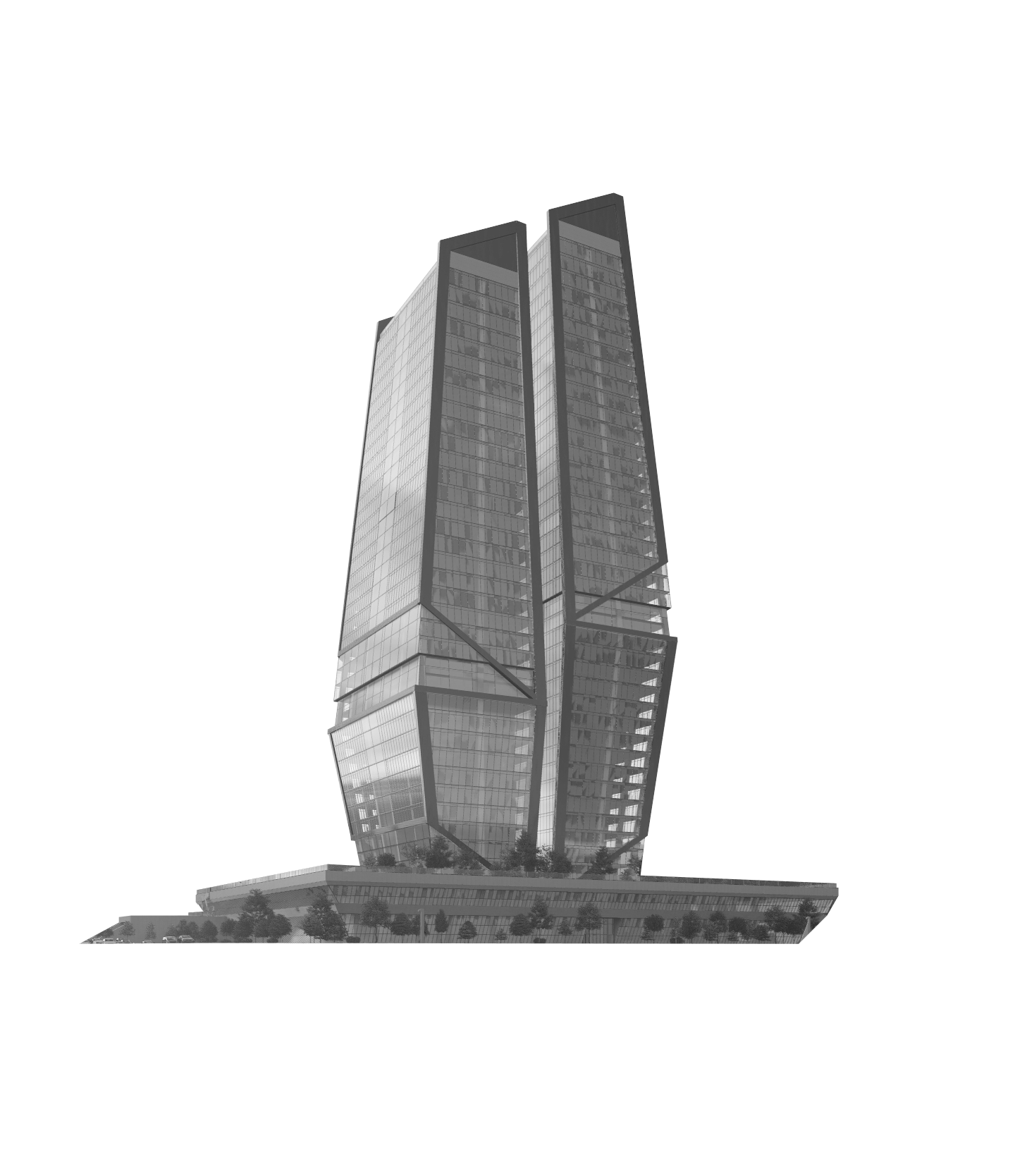 Сужающаяся к верху форма визуально облегчает объём, а стеклянные фасады растворяют здание в окружающей среде.