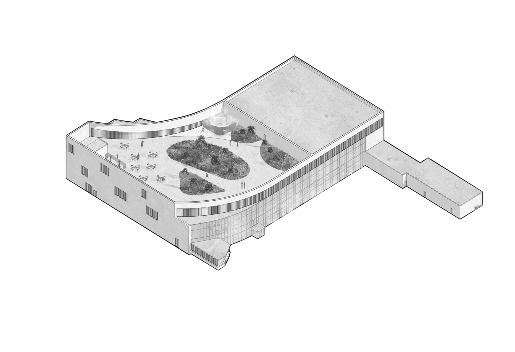 В юго-восточной части участка спроектирована открытая зона отдыха, отделённая от здания витражной системой, вход на которую осуществляется из зоны отдыха. На данной территории расположен подогреваемый выплывной бассейн, морской бассейн, зона отдыха, термальные комнаты и кафе, предполагается круглогодичное использование данной зоны.