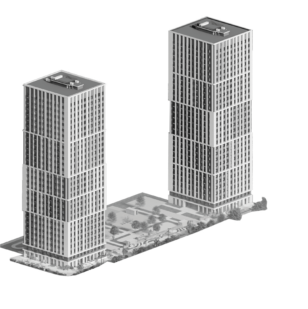 Две башни по 30 этажей стоят на стилобате, выходящим в один уровень с прилегающей дорогой, которая в последствии сформируется как улица.